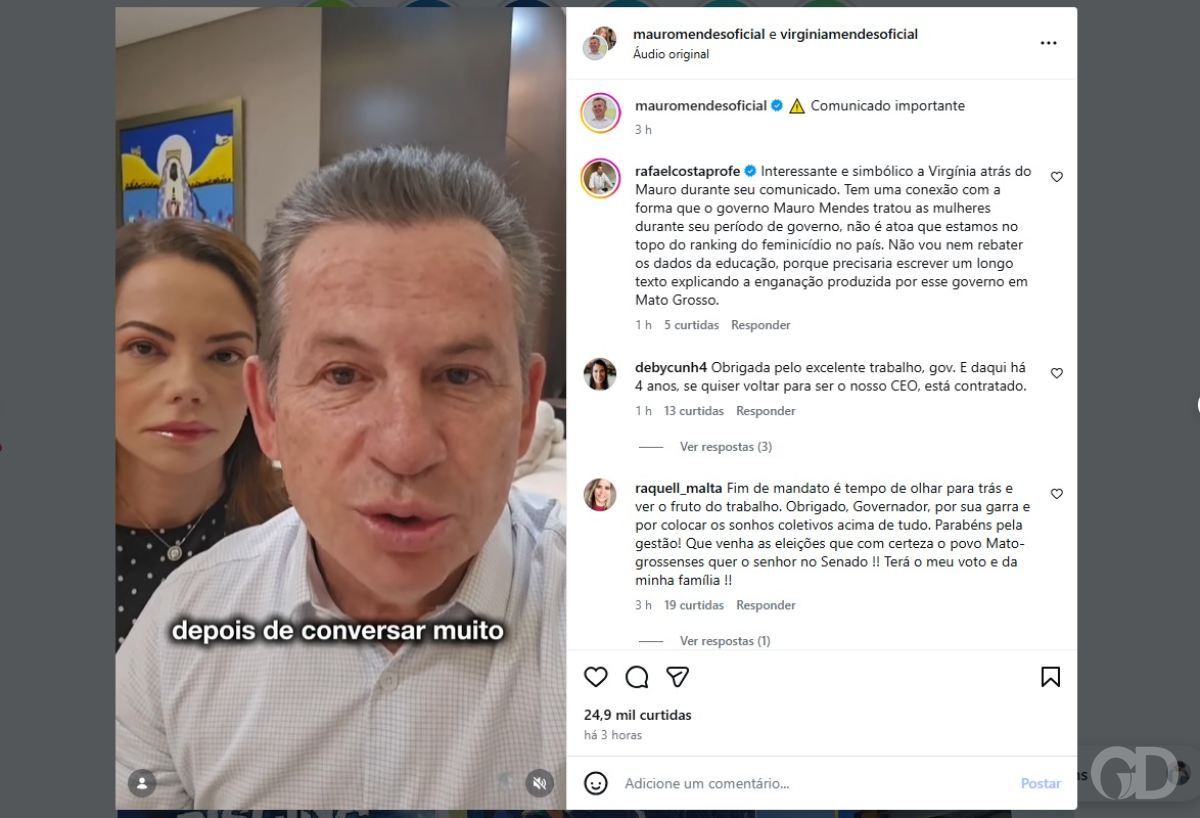 O vídeo com anúncio da saída do governador Mauro Mendes (União) do comando do governo de Mato Grosso, justamente para disputar uma das duas vagas ao Senado, viralizou nas redes sociais. Publicado nas primeiras horas da manhã, o post já ultrapassou as 300 mil visualizações e conta com 24 mil curtidas, 4 mil comentários e quase 3 mil compartilhamentos.