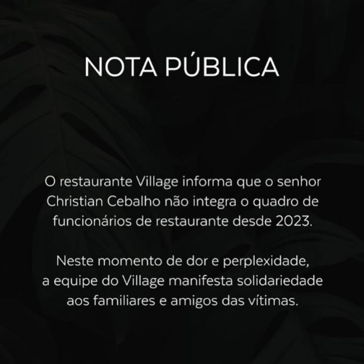 Após ter seu nome envolvido em caso de homicídio, o restaurante Village se prenunciou para esclarecer que o acusado Cristian Cebalho não é mais funcionário do estabelecimento.