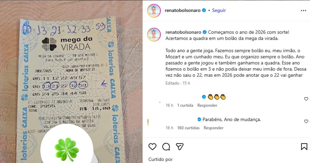 Em rede social, ele comemorou a vitória com o número 13 entre os sorteados. Na legenda, ele escreveu “Dessa vez não saiu o 22, mas em 2026 pode anotar que o 22 vai ganhar”.