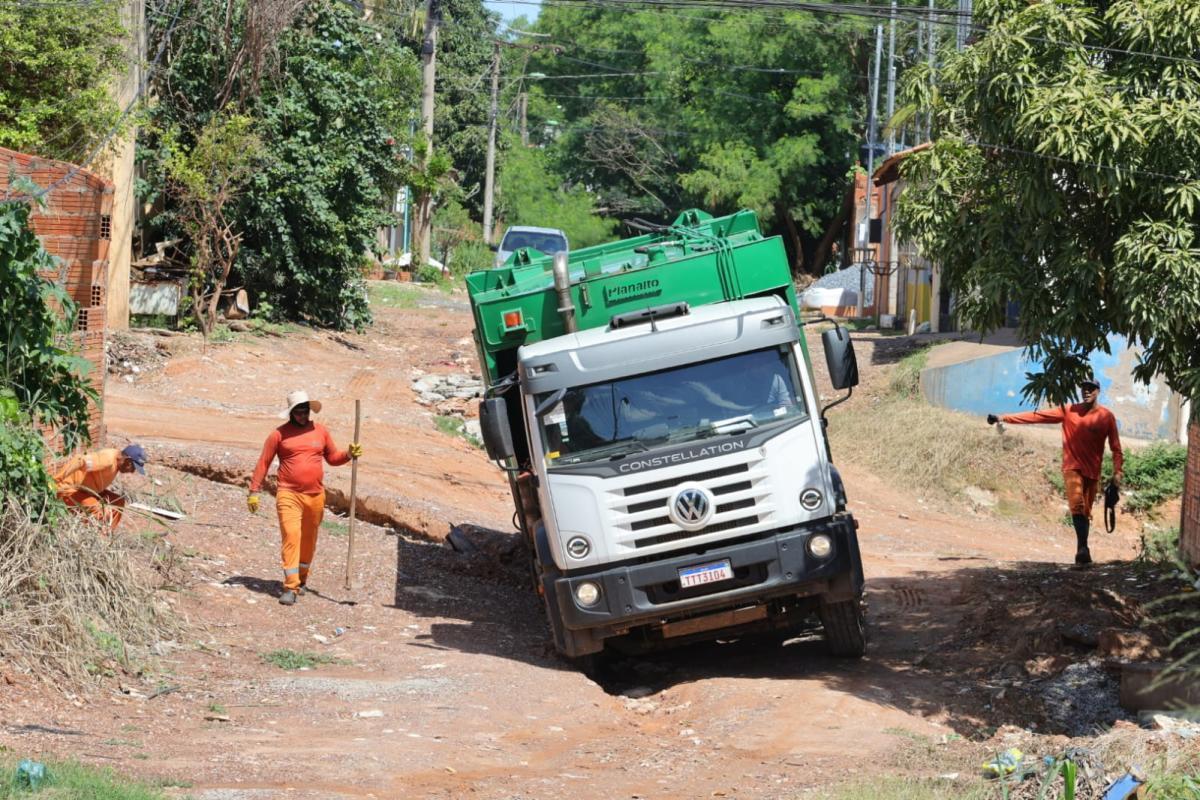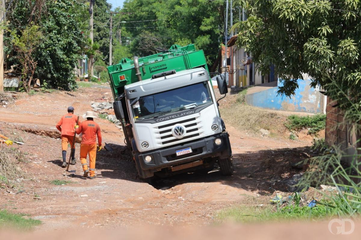 Caminhão da coleta seletiva atolou em uma valeta aberta no meio da rua, sem asfalto, de uma das vias do bairro Serra Dourada, em Cuiabá, na manhã desta sexta-feira (9).