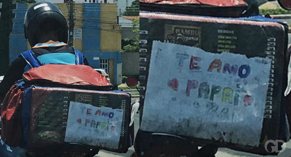 Uma imagem semelhante viralizou nas redes sociais, em julho deste ano. No trânsito do ABC Paulista, um motoboy carregava uma folha escrita pela filha: “motorista, cuidado com o meu papai, eu amo ele mil milhões... Assinado: Lagartixa”.