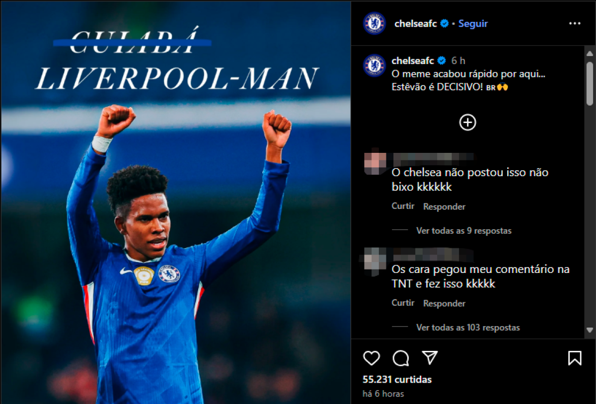 O Chelsea fez uma brincadeira com o nome de Cuiabá em sua página oficial no Instagram ao publicar o apelido “Cuiabá Man” para o atacante brasileiro Estêvão.