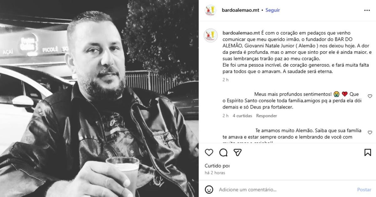 O empresário Giovanni Natale Junior morreu nesta segunda-feira (3), em Cuiabá. Dono do Bar do Alemão, famoso na Capital, o óbito foi comunicado na rede social do estabelecimento, no começo da tarde hoje.