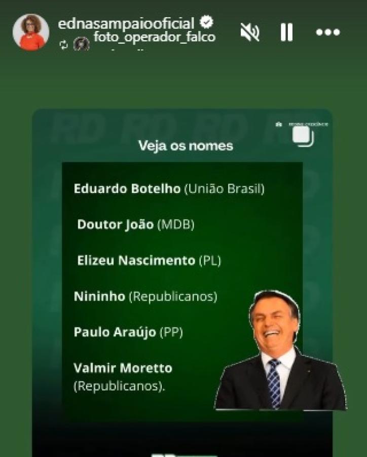 Ela não quis dizer os nomes em entrevista, mas compartilho conteúdo divulgado na imprensa em sua rede social, confirmando a lista com Eduardo Botelho (União), Nininho (Republicanos), Doutor João (MDB), Elizeu Nascimento (PL), Paulo Araújo (PP) e Valmir Moretto (Republicanos).