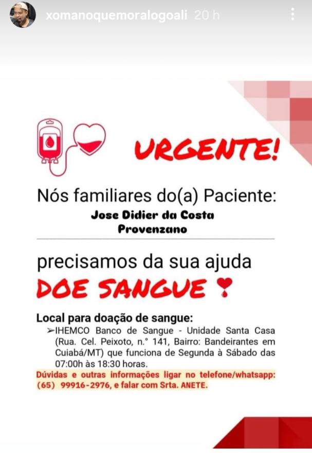 A família do humorista cuiabano José Didier, o Xômano que Mora Logo Ali, faz convoca os seguidores a doarem sangue ao paciente internado no Hospital Geral e Maternidade de Cuiabá (HG). Ele deixou a Unidade de Terapia Intensiva (UTI) esta semana, mas segue na enfermaria por conta de uma anemia severa e infecção em tratamento.