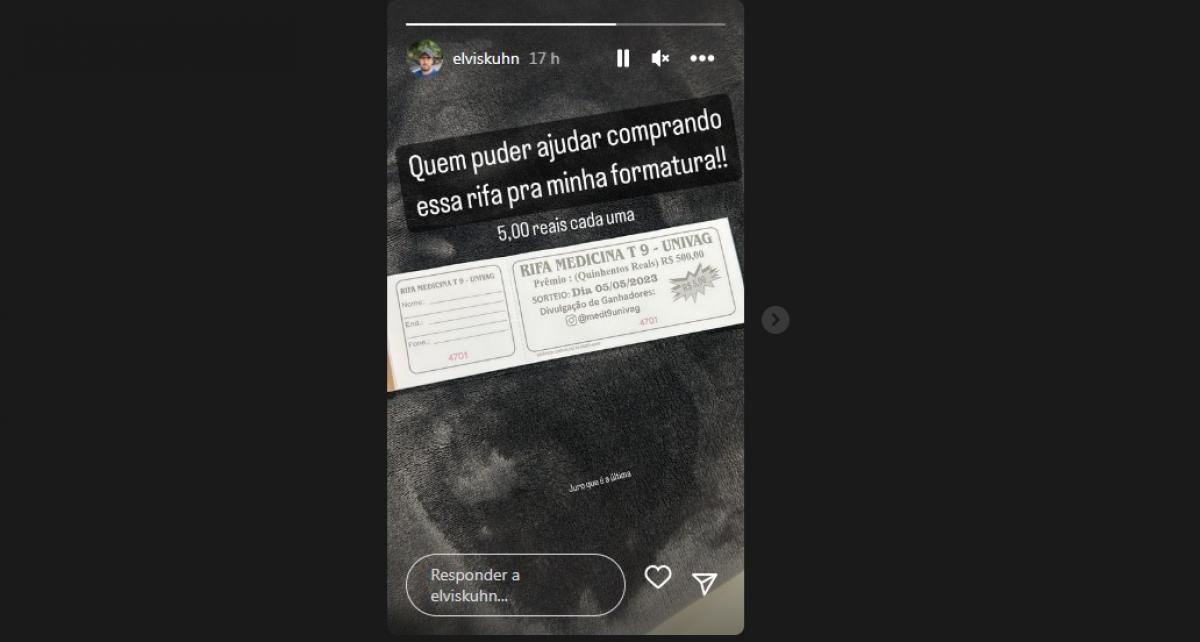 Nas redes sociais o jovem apelou aos amigos pedindo que o ajudasse comprando um número por R$ 5,00. Os participantes irão concorrer ao prêmio de R$ 500. “Quem puder ajudar comprando essa rifa pra minha formatura, R$ 5,00 cada uma”, escreveu no Instagram. Elvis ainda prometeu que essa seria a última rifa. “Juro que essa é a última”, acrescentou.