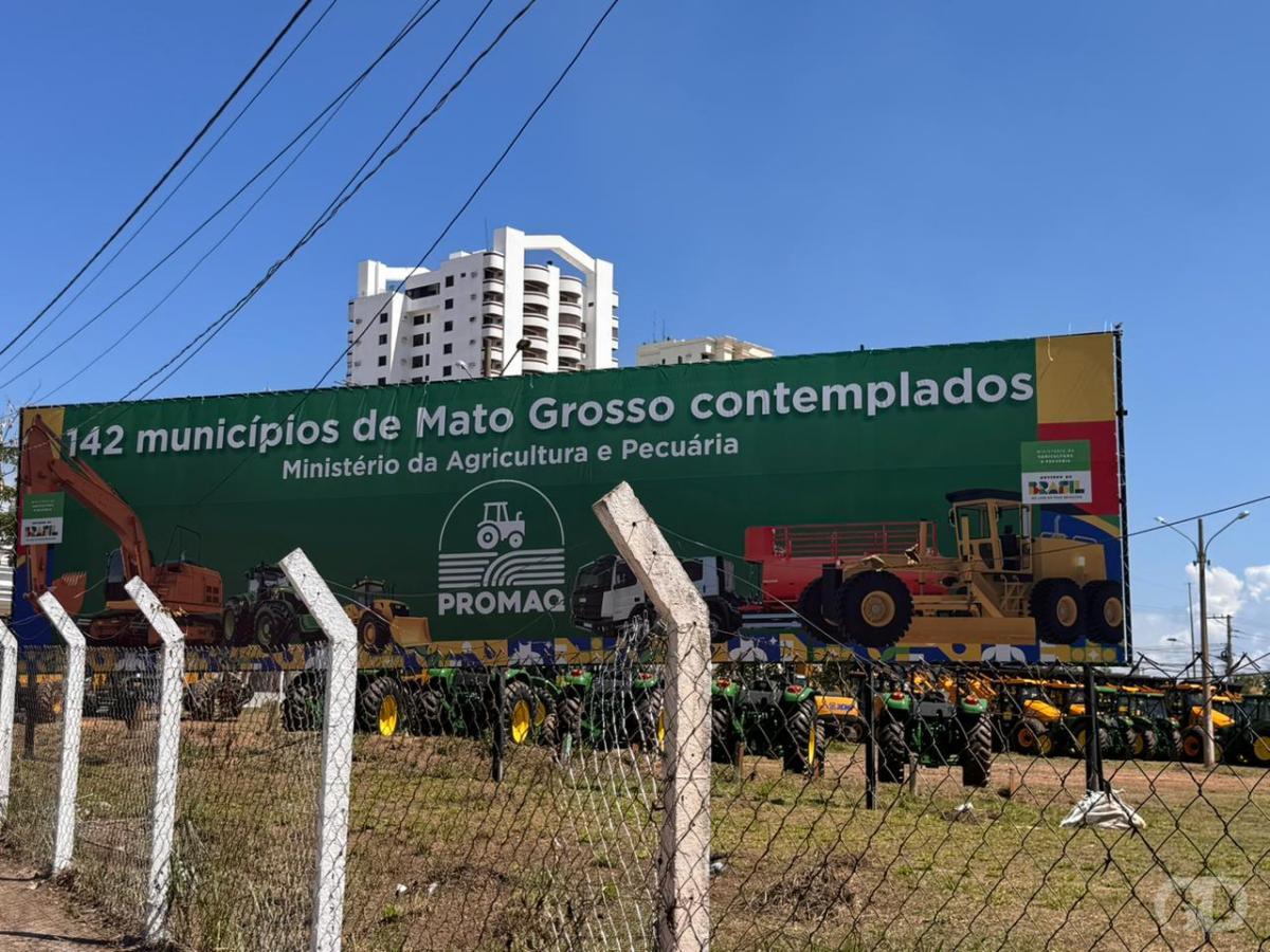O governo Federal expõe, em um terreno aberto na Avenida do CPA, em Cuiabá, diversas máquinas agrícolas que serão destinadas aos 142 municípios de Mato Grosso por meio do Programa Nacional de Modernização e Apoio à Produção Agrícola (Promaq), do Ministério da Agricultura e Pecuária (Mapa), pasta comandada pelo ministro Carlos Fávaro (PSD). No local, foram instalados dois grandes outdoors com a mensagem “142 municípios de Mato Grosso contemplados”.