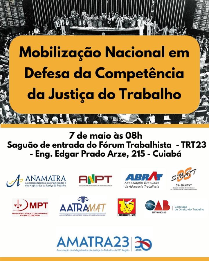 A mobilização, em Mato Grosso, é organizada pela AMATRA 23 com a OAB-MT, ANAMATRA, ANPT, ABRAT, MPT, AATRAMAT, SINDIJUFE e SINAIT
