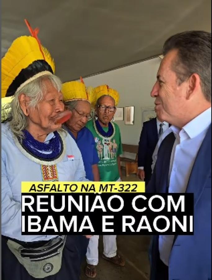 O governador Mauro Mendes (União) cumpriu agendas em Brasília nesta quinta-feira (6). Entre os compromissos estava reunião no Ibama para pedir autorização para pavimentar área indígena e teve a participação do cacique Raoni.