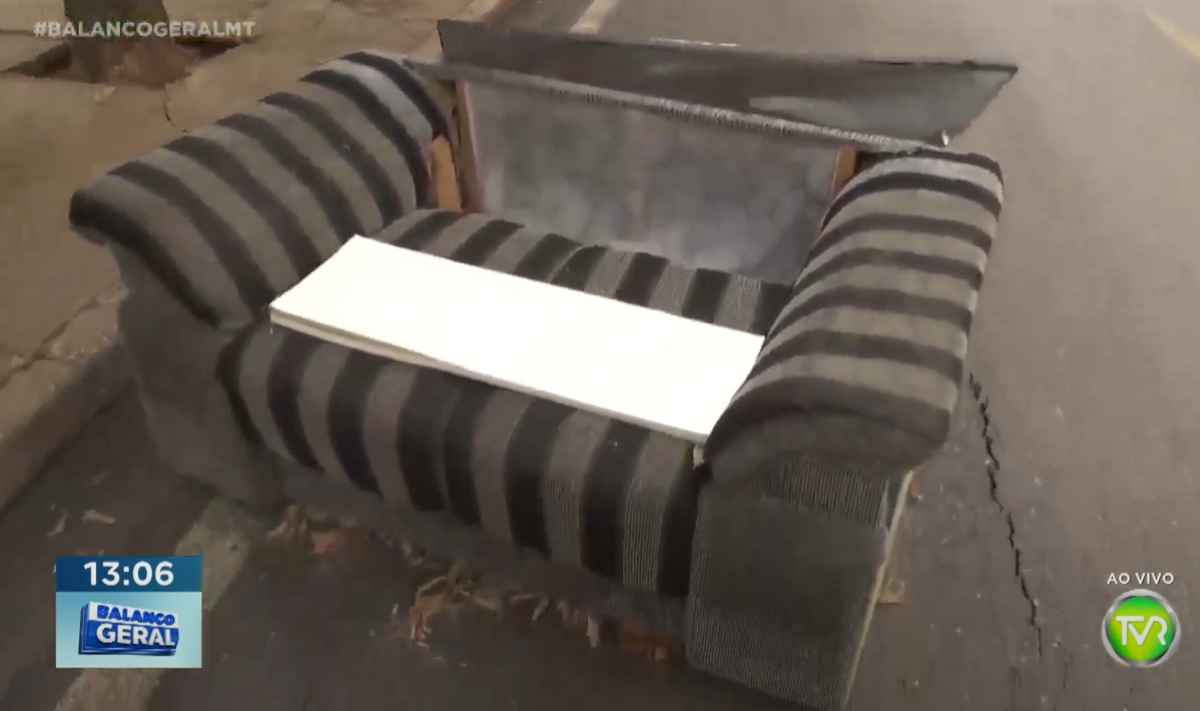 Moradores do bairro Miguel Sutil, em Cuiabá, colocaram um sofá no meio da rua para sinalizar um grande buraco no local e assim evitar acidentes com motoristas que passam pela rua N.