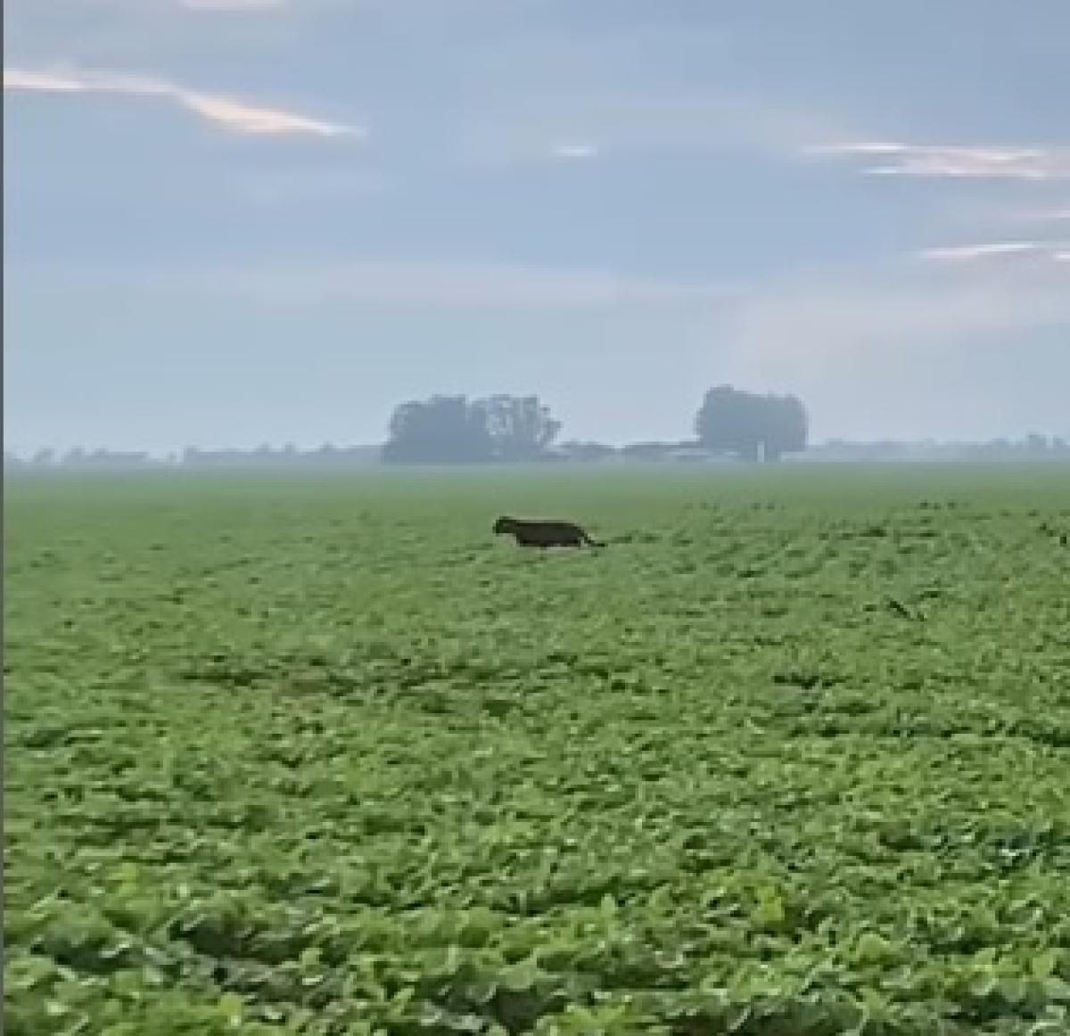 Uma onça-pintada foi flagrada correndo por uma lavoura de soja e atravessando a estrada em Sinop, essa semana.