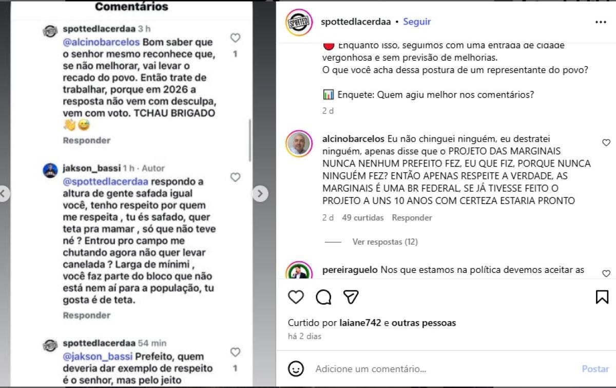 “Tirei print de todos os comentários feitos pelo atual prefeito Jackson e pelo ex-prefeito Alcino em resposta a uma simples cobrança sobre a entrada da cidade, que segue abandonada, sem iluminação e sem organização”, diz a legenda da publicação.