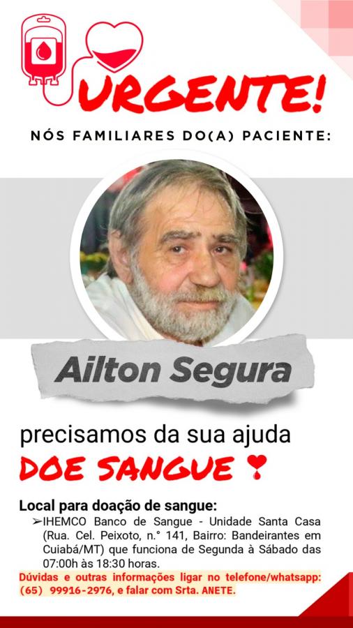 Familiares, amigos e colegas fazem campanha para doação de sangue em prol da saúde do jornalista Ailton José Segura. Ele está internado no Complexo Hospitalar de Cuiabá e apresenta um quadro grave de anemia que necessita de transfusões.