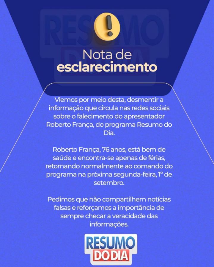 Após rumores sobre a saúde do ex-prefeito e apresentador Roberto França, o programa Resumo do Dia, do qual é âncora, emitiu nota alegando férias.
