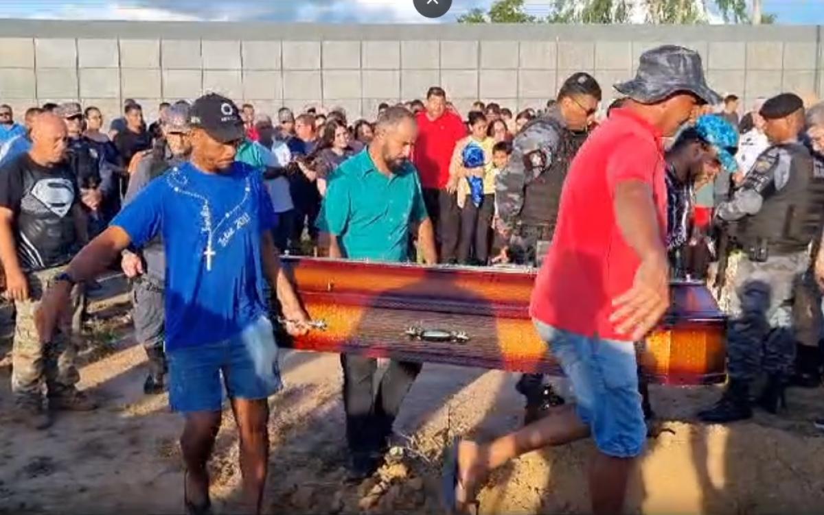 O caixão do agente morto em dia de folga foi carregado e colocado na cova por civis que conheciam o militar. O enterro ocorreu na tarde de terça-feira (23).