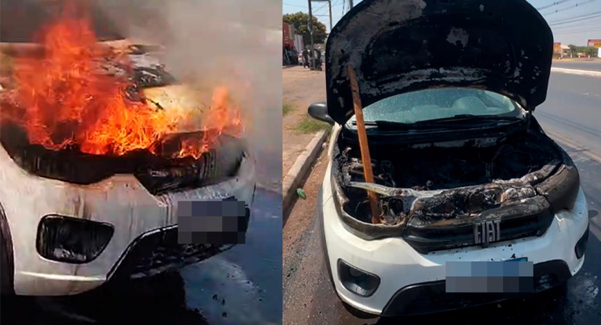 Em vídeos que circulam pelas redes sociais é possível ver o veículo de modelo Fiat Mobi estacionando na via e tomado por chamas e fumaça, enquanto populares jogam água com auxílio de um balde.