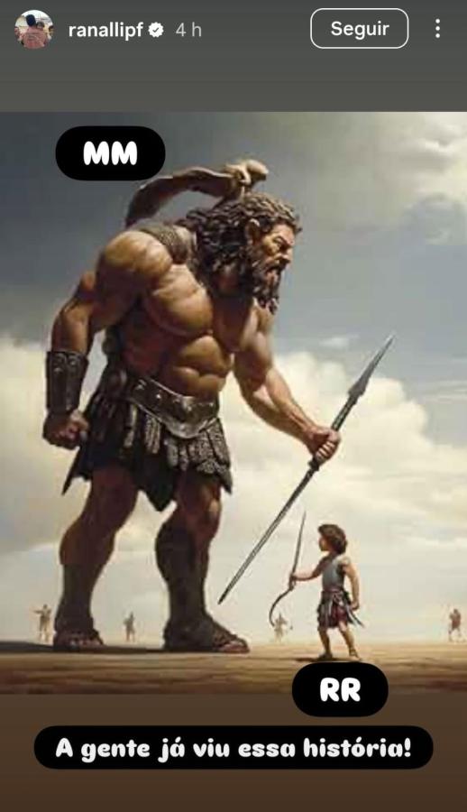 Na imagem ele coloca MM (Mauro Mendes) como o gigante e ele RR, representando Davi na vitória improvável sobre o favorito. A passagem pontua que Davi só venceu o gigante Golias porque confiou em Deus e não em sua própria força.