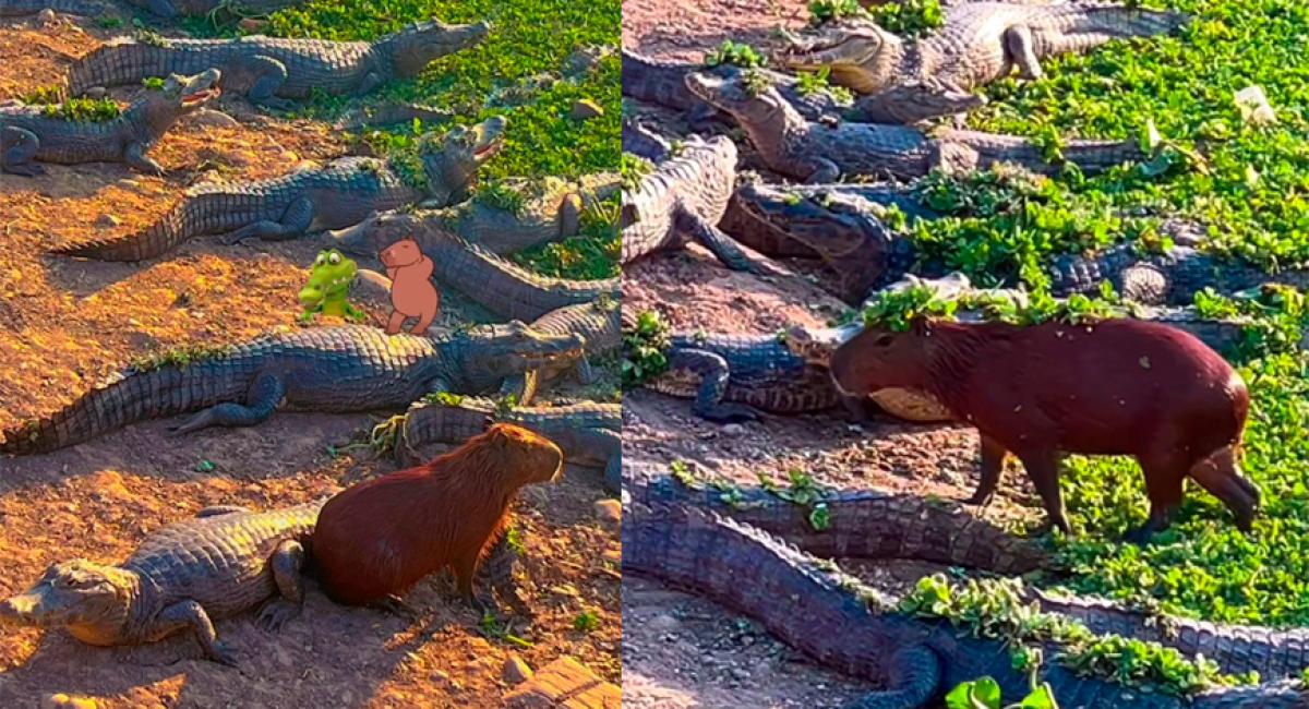 Vídeo publicado nas redes sociais nesta segunda (2) mostra uma capivara caminhando tranquilamente em meio a jacarés, no Pantanal.