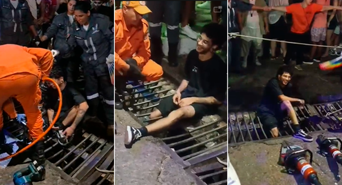 Na filmagem, os militares estão cortando as barras e, após ser retirado, o jovem e os foliões comemoram o resgate. Em postagem das redes sociais, o rapaz comentou o ocorrido “tinha acabado de chegar no trem e, por irresponsabilidade do governo e do evento, mal tô conseguindo andar”. Ele estava no Bloco Baguncinha, com concentração na avenida.