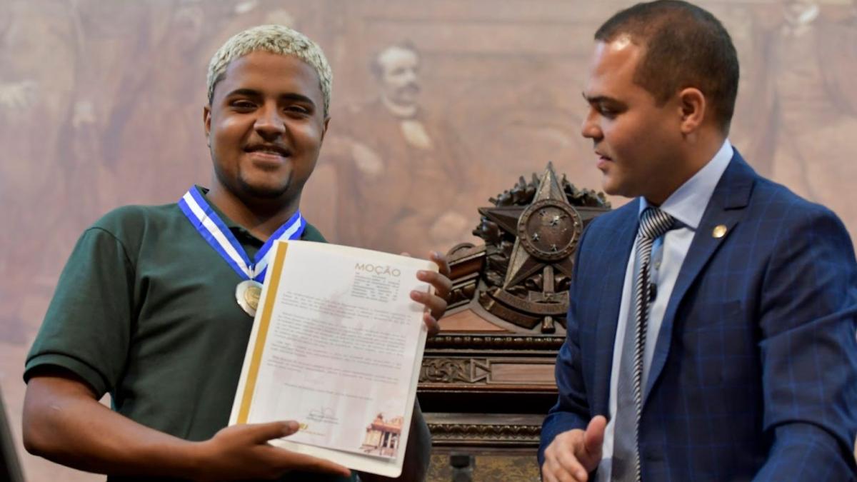 A Assembleia Legislativa do Rio de Janeiro entregou, na noite dessa quarta-feira (10), a Medalha Tiradentes e uma moção de aplausos e louvor a Marcos Vinicius Vasconcelos, que ficou conhecido como o "Herói da Baixada", por seu ato de coragem ao resgatar uma mãe e suas duas bebês de um carro arrastado pelo temporal em Nova Iguaçu, na Baixada Fluminense, em fevereiro.