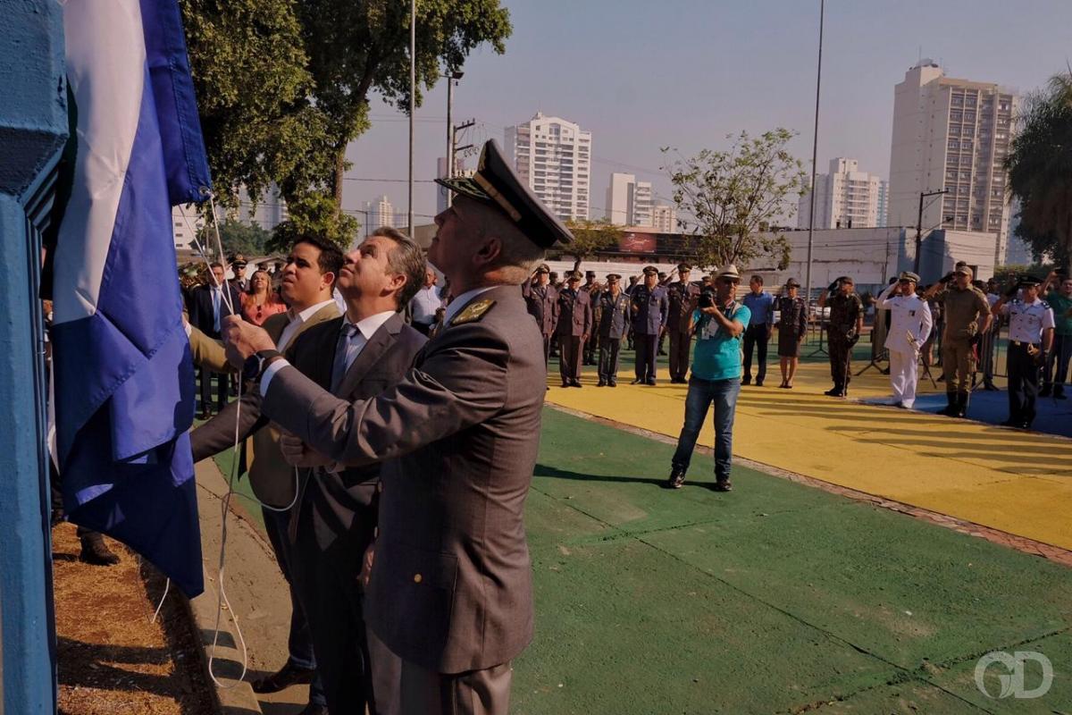 A cerimônia foi iniciada que com hasteamento da bandeira do Brasil, erguida pelo governador Mauro Mendes (DEM).