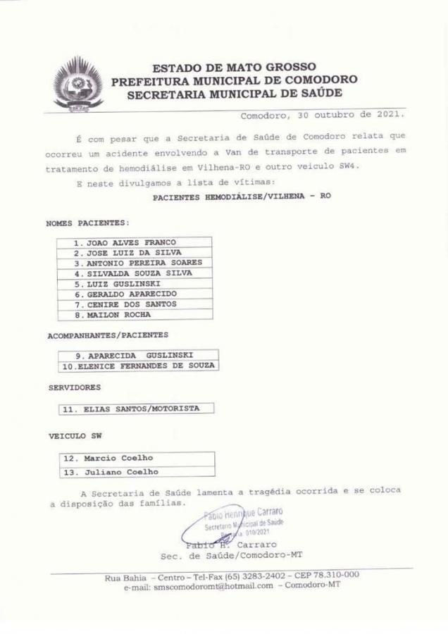 Secretário de Saúde de Comodoro, Fábio Carraro, divulgou em nota os nomes das vítimas. Ele lamentou a tragédia e se coloca à disposição das famílias.