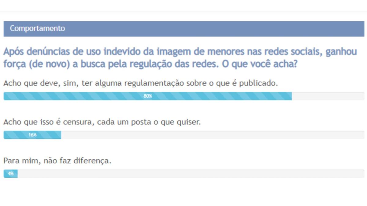Outros 16% acreditam que a regulamentação propõe uma forma de “censura” e defendem que “cada um posta o que quiser”. Já os 4% restantes opinam que para eles o tema “não faz diferença”. Os resultados podem ser conferidos na aba “Enquete” do site.