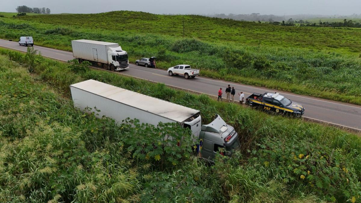 A carreta, carregada com carne e com destino ao estado do Rio de Janeiro, saiu da pista e parou no matagal às margens da rodovia. O motorista não se feriu e permaneceu no local para prestar esclarecimentos.