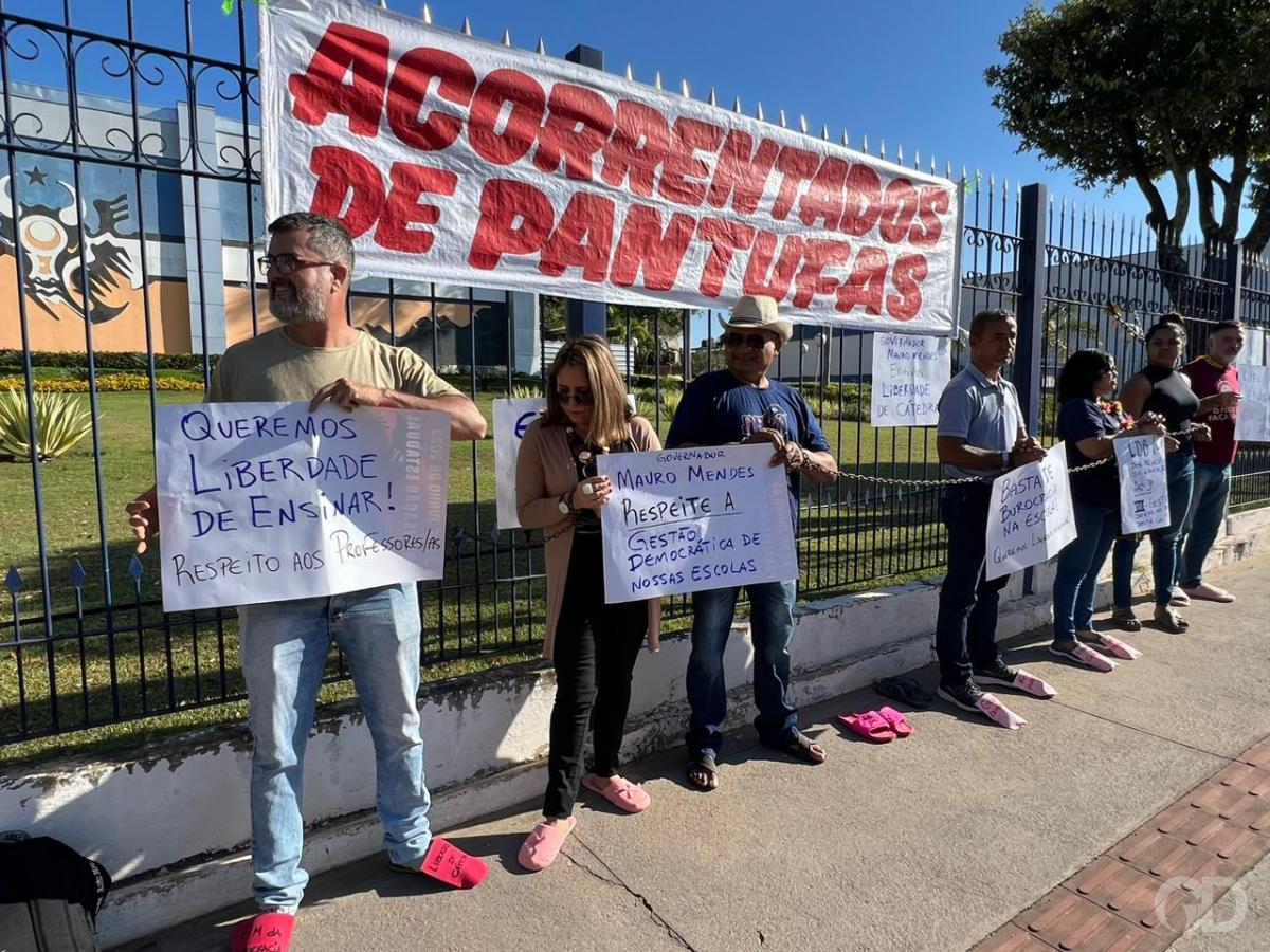 Acorrentados nas grades do Palácio Paiaguás, professores da rede estadual de ensino fizeram um ato na manhã desta segunda-feira (17) contra ações do governador Mauro Mendes na área da Educação.