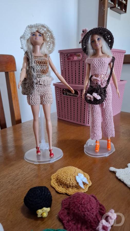 Da linha grossa dos tapetes nasceram miniaturas delicadas: vestidos, chapéus e bolsas para bonecas. “Um dia sonhei com uma bolsinha pequenininha e fiz. Achei tão linda! Depois comecei a fazer roupinhas. É uma coisa tão delicada que me enche de alegria”, diz.