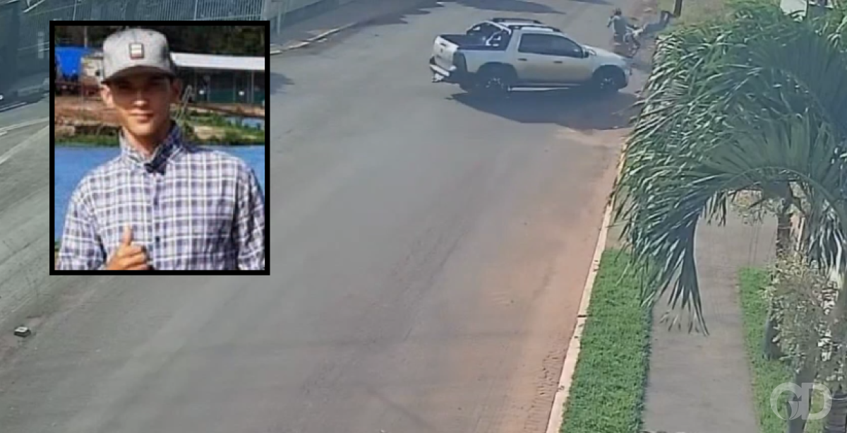 Câmera de segurança registrou o momento em que um veículo atinge uma motocicleta e causa a morte de José Fernando Lourenço Alegrini, 22, na tarde de terça-feira (28), no bairro Vila Alta, em Tangará da Serra (239 km a médio-norte de Cuiabá). Um segundo ocupante da moto ficou ferido.