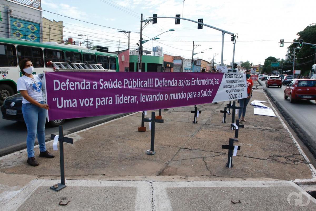 Um protesto na avenida Tenente Coronel Duarte, a Prainha, lembra, nesta terça-feira (12), as mortes dos profissionais de enfermagem durante a pandemia do novo coronavírus. Segundo o Sindicato dos Servidores da Saúde de Mato Grosso (Sisma), pelo menos 50 trabalhadores foram contaminados pela covid-19 no estado, com uma morte registrada. A ação também marca o Dia Mundil do Enfermeiro.
