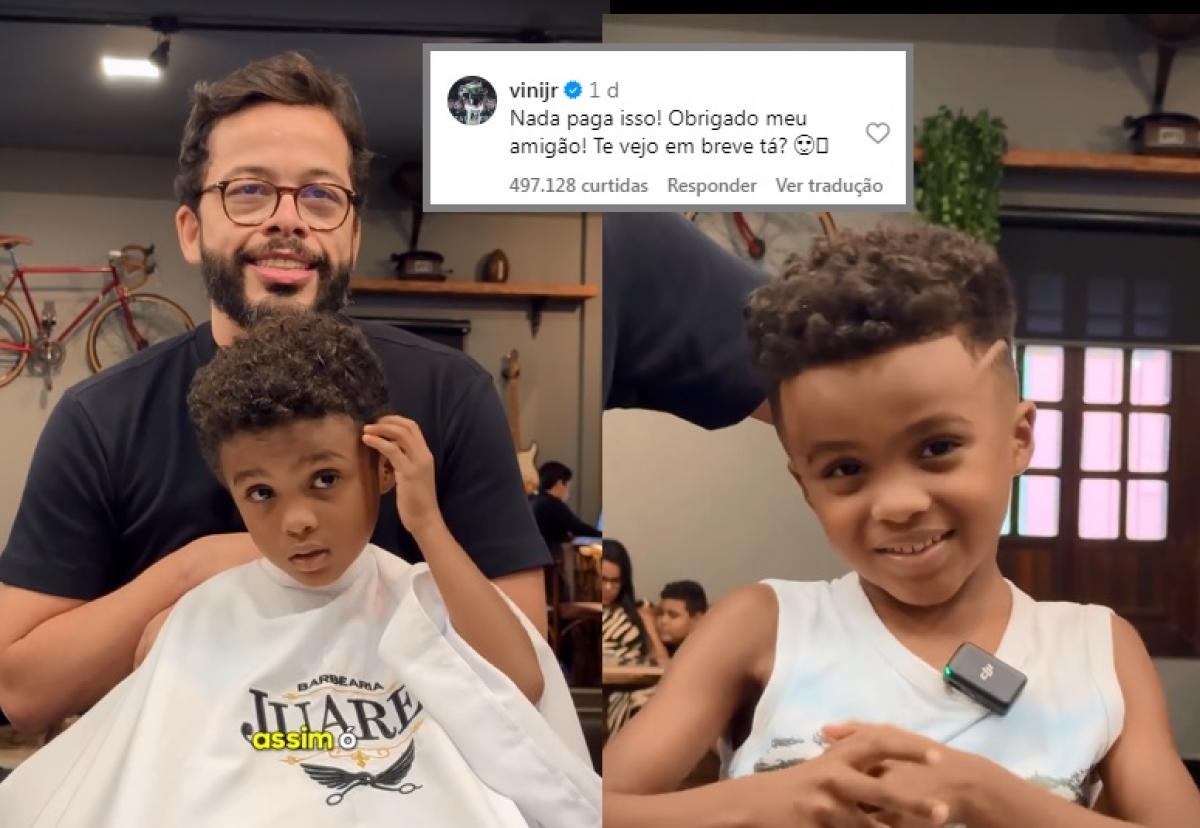 No final do atendimento, o menino aparece sorridente e encantado com o novo estilo. “Ficou igual, te amo Vini Jr”, expressa o pequeno.