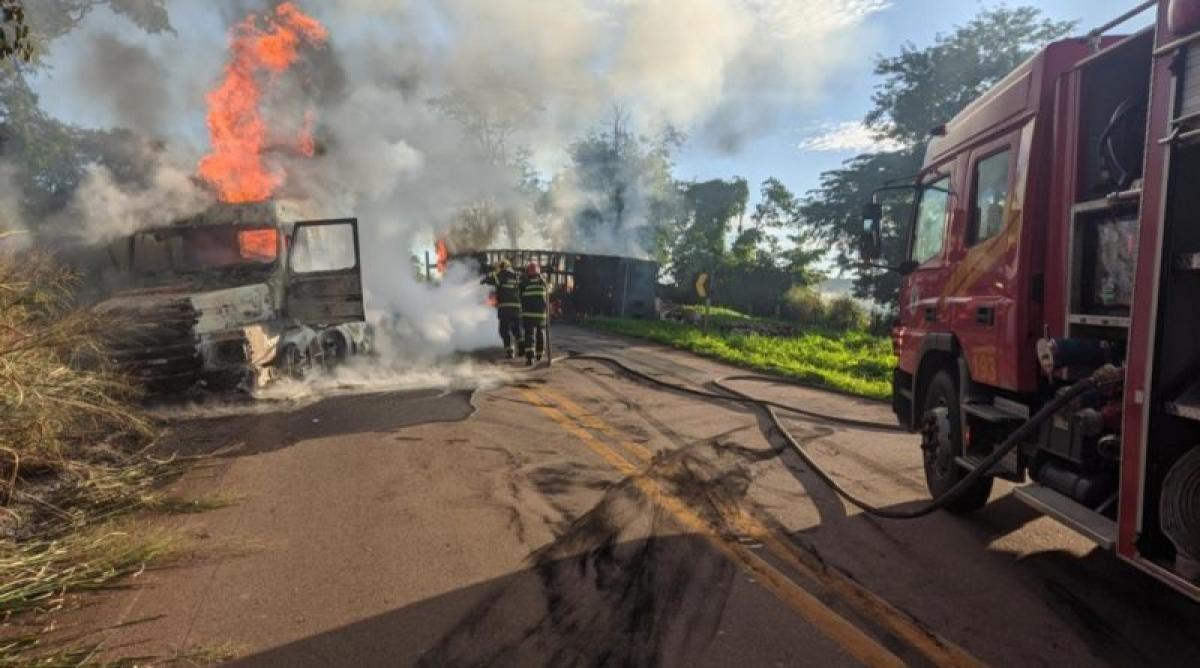 Atualizada às 15h30 - Uma carreta carregada com plumas de algodão pegou fogo em acidente com outros 3 veículos de carga, no final da manhã desta quinta-feira (16), na pista sul da BR-364, em Santo Antônio de Leverger (34 km ao sul de Cuiabá). O trecho da rodovia, que liga Cuiabá ao sul do estado ficou interditado até às 15h.