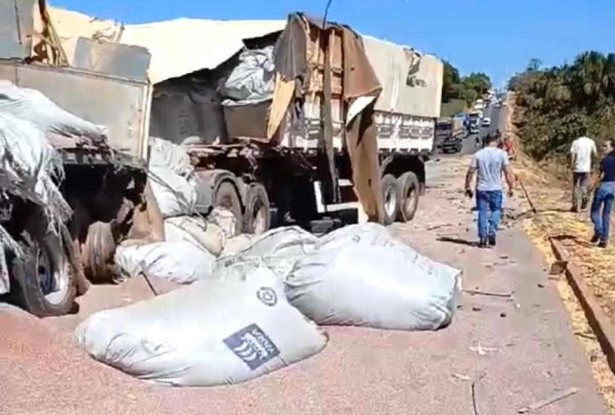 A terceira carreta foi atingida na lateral e teve parte da carga de milho e espalhada na pista.