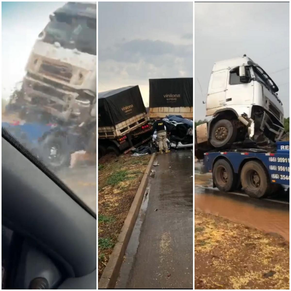 Atualizada às 19h20 - Um acidente entre 4 carretas e um carro, na tarde desta quinta-feira (21), deixou uma pessoa ferida e travou o trânsito na BR-163, em Sorriso (a 397 km de Cuiabá). Chovia na hora. Todos os outros saíram ilesos.