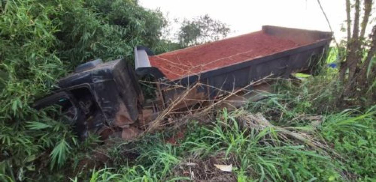 Devido ao impacto, o caminhão, carregado com terra, saiu da pista e caiu do acostamento. Foi necessário um guincho para a retirada do veículo da mata