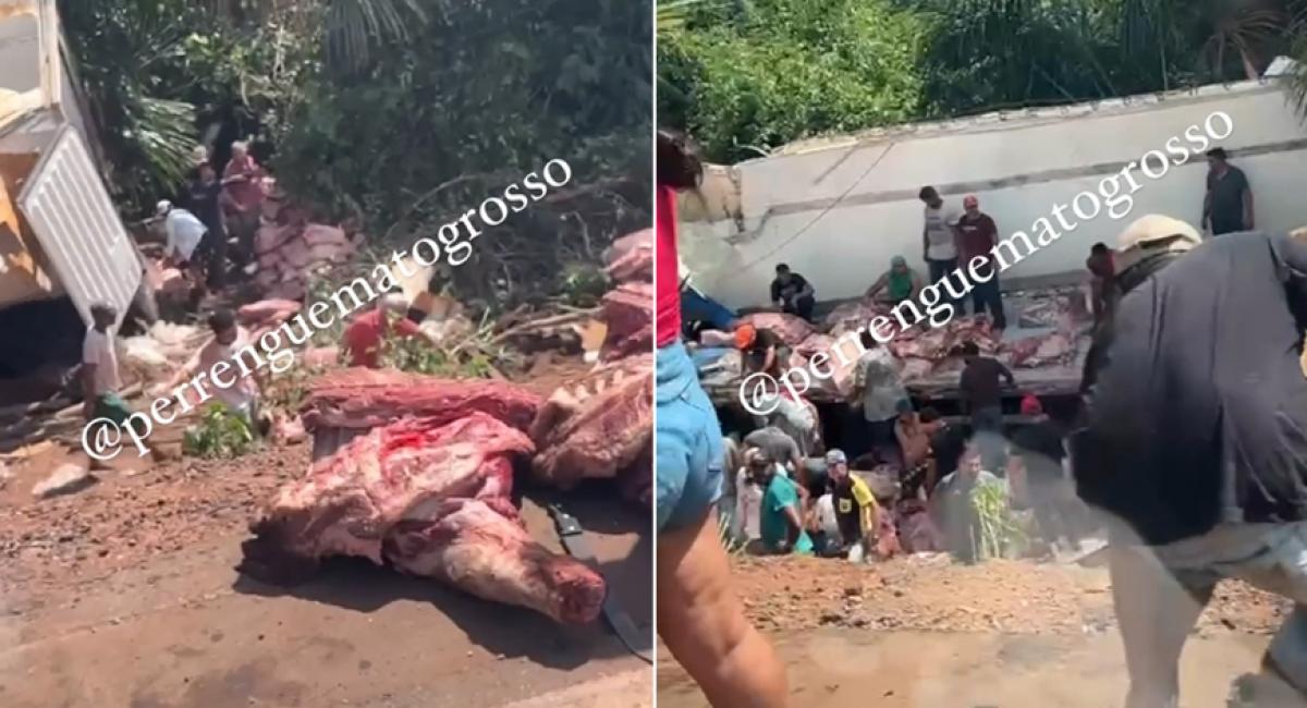 Em vídeo publicado pela página "Perrengue Mato Grosso" é possível ver o caminhão tombada na lateral da rodovia e uma grande quantidade de pessoas saqueando a carga em carretes.