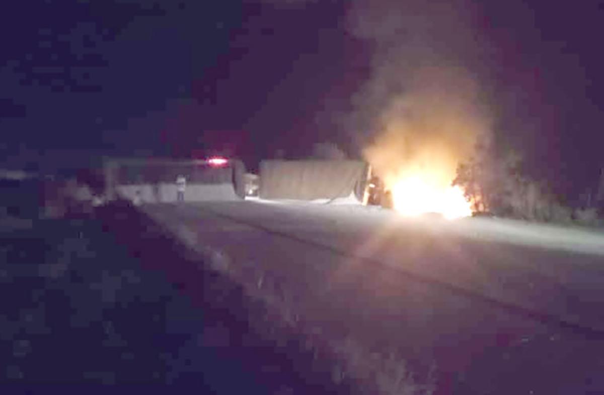 Um caminhoneiro precisou fugir pela janela do veículo para sobreviver após incêndio. O acidente ocorreu na madrugada desta segunda-feira (10), na BR-163, em Guarantã do Norte.