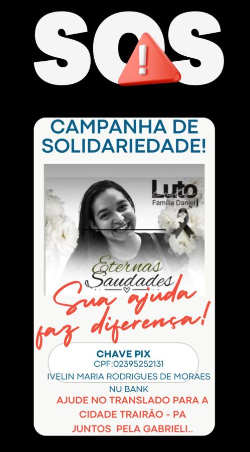 A família de Gabrieli Daniel de Sousa, 31, pede ajuda para translado do corpo da mulher para Trairão, no Pará, onde moram os familiares. Ela foi morta a tiros pelo marido, o policial militar Ricker Maximiano de Moraes, 32, na tarde de domingo (25).