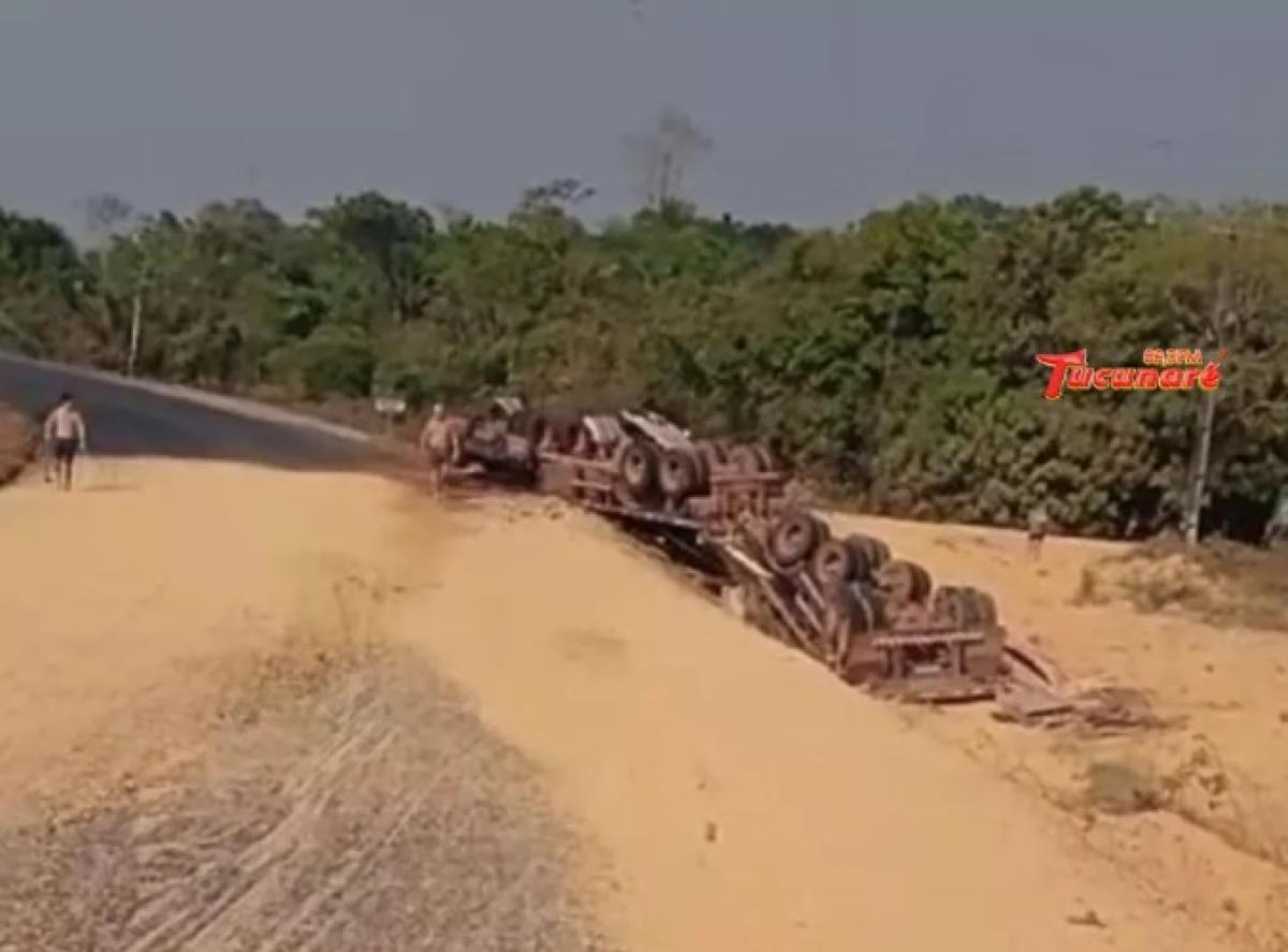 Segundo informações da Rádio Tucunaré, o condutor da carreta de 9 eixos perdeu o controle em uma curva e tombou o veículo carregado.