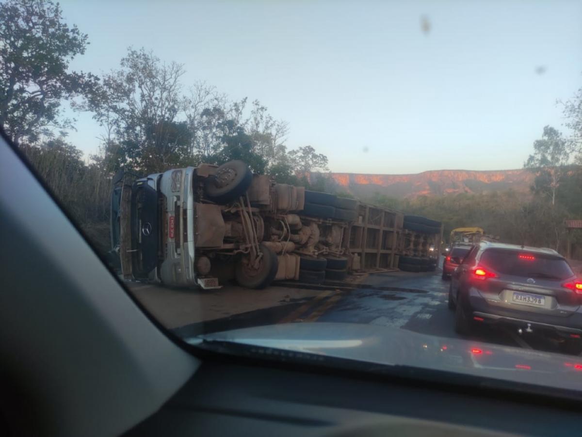 Um acidente deixou o tráfego lento na MT2-251, Estrada de Chapada, na tarde de sábado (3). Um caminhão carretado com óleo tombou em uma curva e o produto ficou derramado na pista.