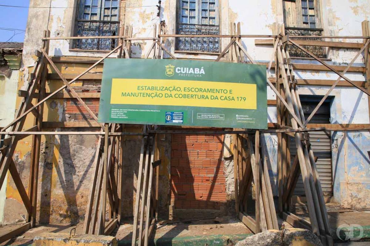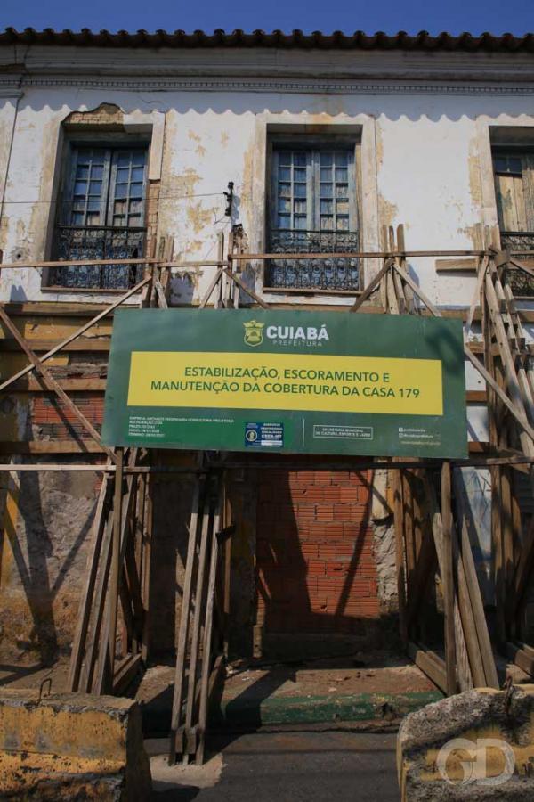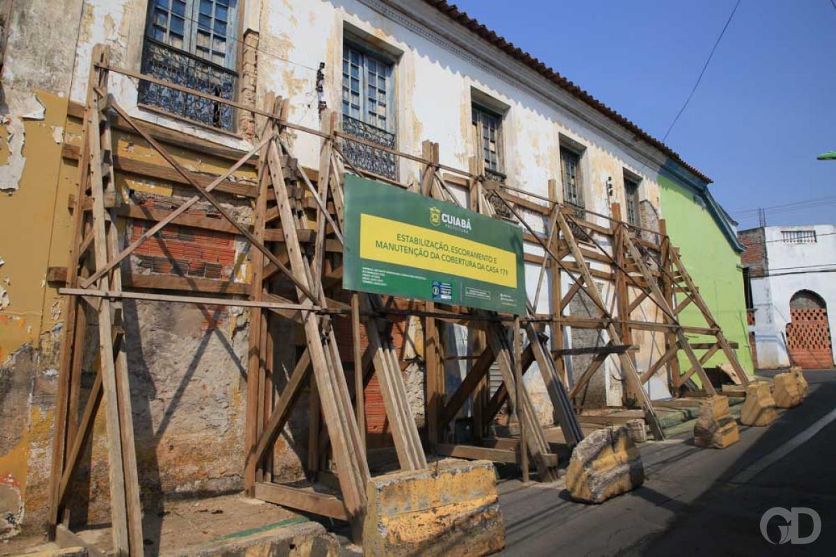 Outro importante imóvel que está cedendo aos efeitos do tempo e do descaso é o casarão de número 179, na rua Campo Grande. O interior do imóvel já caiu há anos e a fachada é sustentada por escoramento feito pela Prefeitura de Cuiabá.