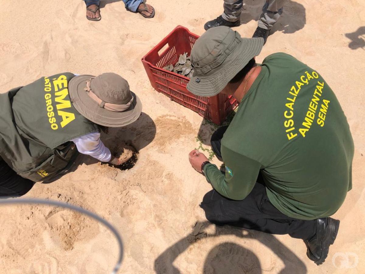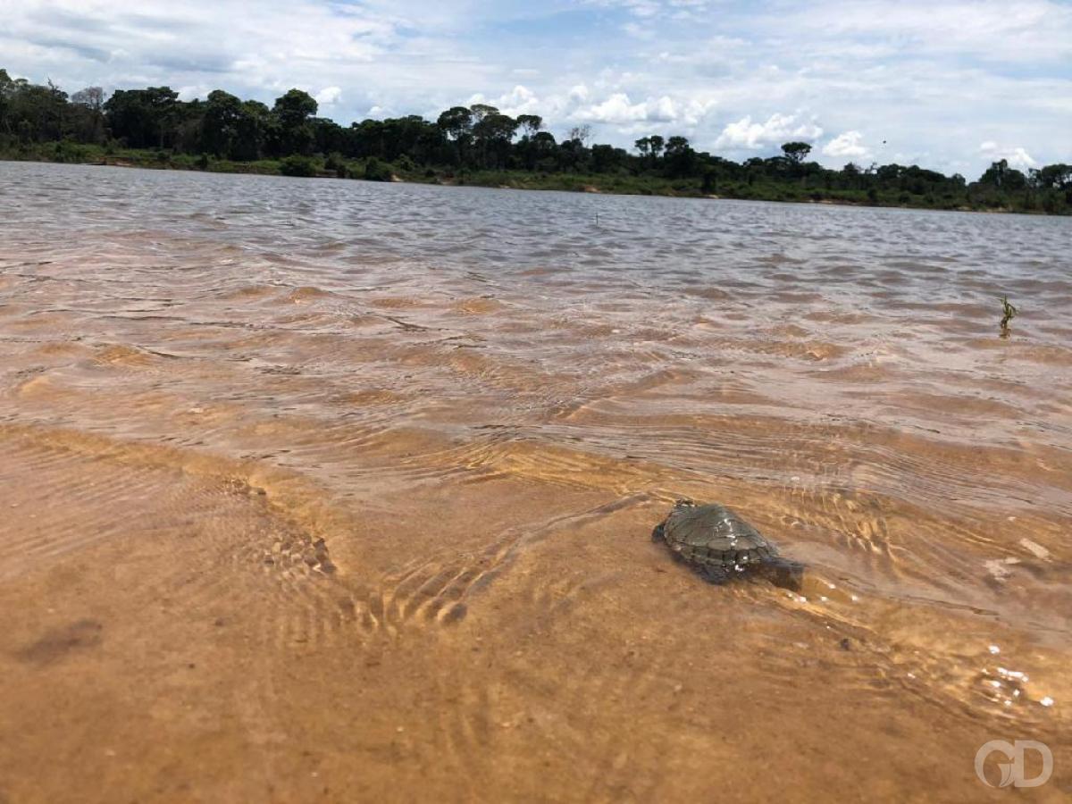 Equipes da Secretaria de Estado de Meio Ambiente (Sema), do Ibama e da Brigada de Incêndio Aliança da Terra monitoram o nascimento das tartarugas da Amazônia do rio das Mortes. O quelônio de água doce que pode chegar a 50 quilos na vida adulta desova, em sua grande maioria, nas praias do Refúgio da Vida Silvestre Quelônios do Araguaia, unidade de conservação estadual.