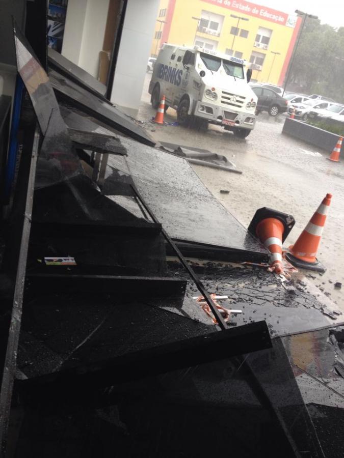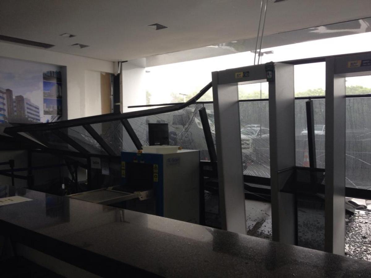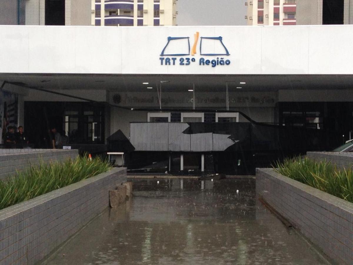 Os estragos da chuva também alcançaram o Tribunal Regional do Trabalho (TRT), que teve parte da estrutura de vidro, que separa as torres dos prédios, quebrada.