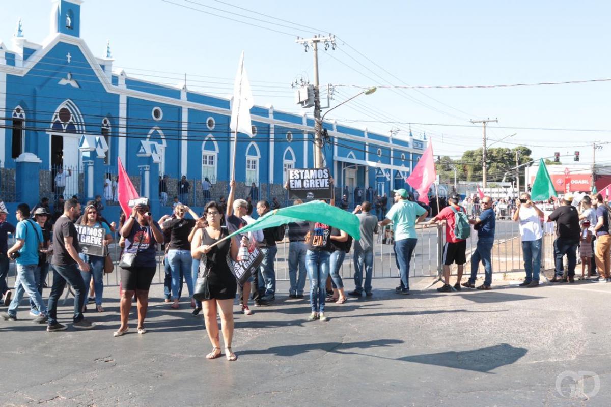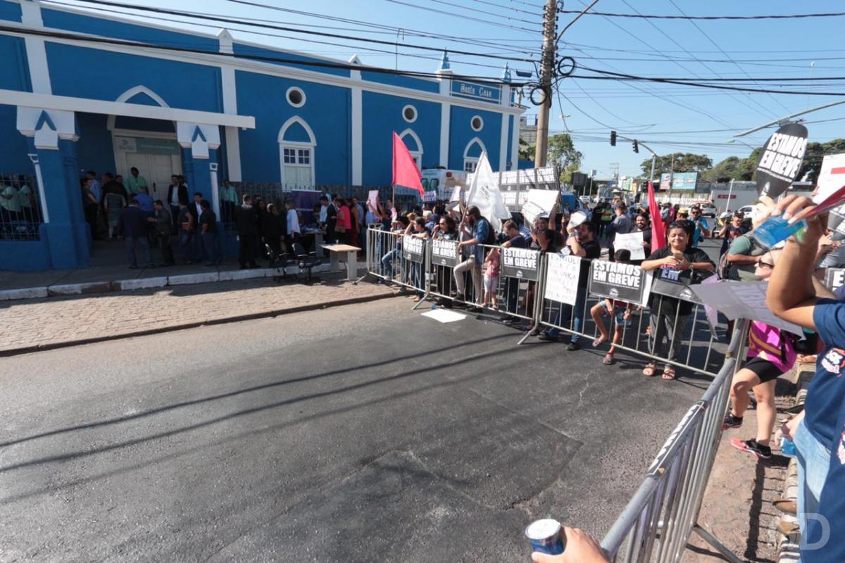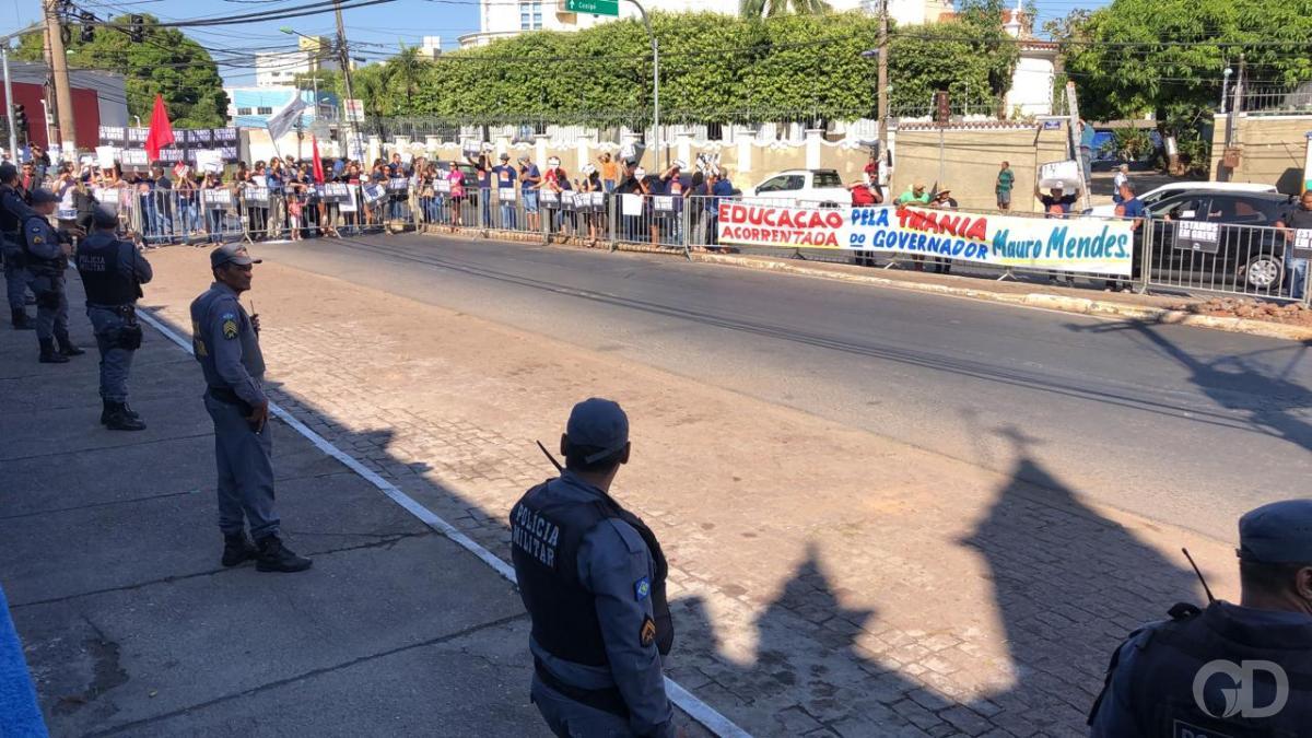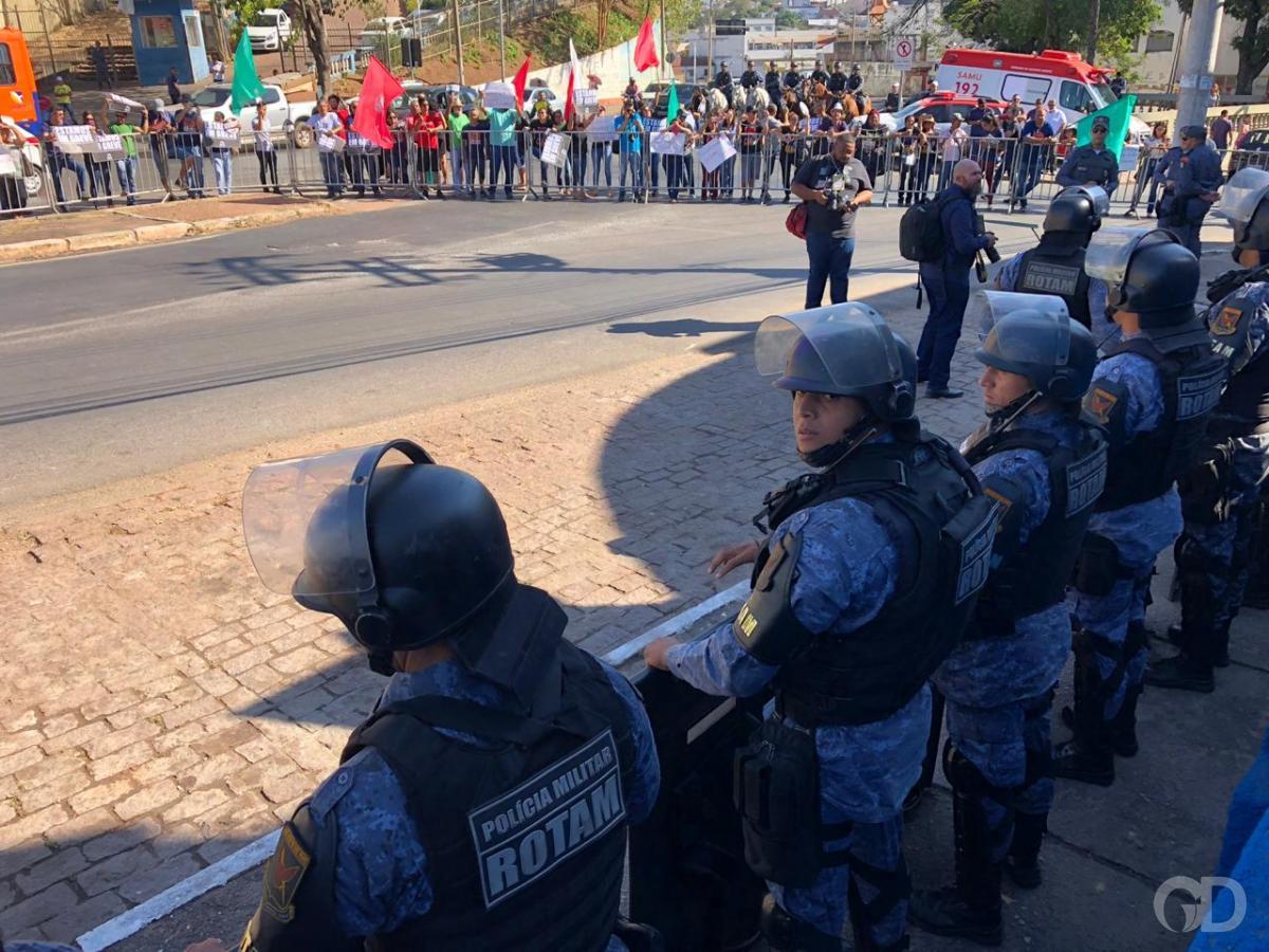 Cerca de 100 servidores da educação protestam na manhã desta terça-feira (23), em frente ao Hospital Estadual Santa Casa. Acorrentados às grades de proteção, os grevistas participam da reinauguração do hospital, que terá a presença do ministro da Saúde, Luiz Mandetta. A segurança foi reforça na região da Santa Casa, com direito à cavalaria.