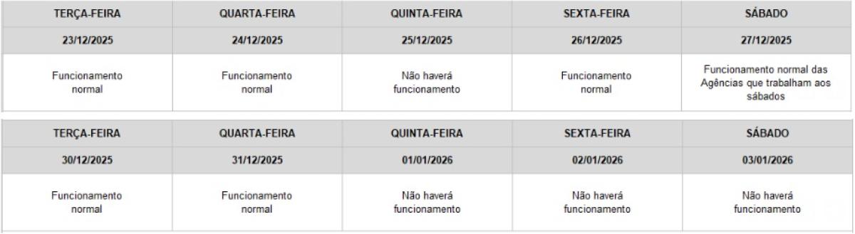 Conforme divulgado pela empresa, durante os feriados, além do fechamento das agências, as entregas de cartas e encomendas também pararam. Em dezembro, o cronograma aponta funcionamento normal nos dias 23,24,26, 27, 30 e 31. Em janeiro, porém, os atendimentos só retornam na segunda-feira (5).