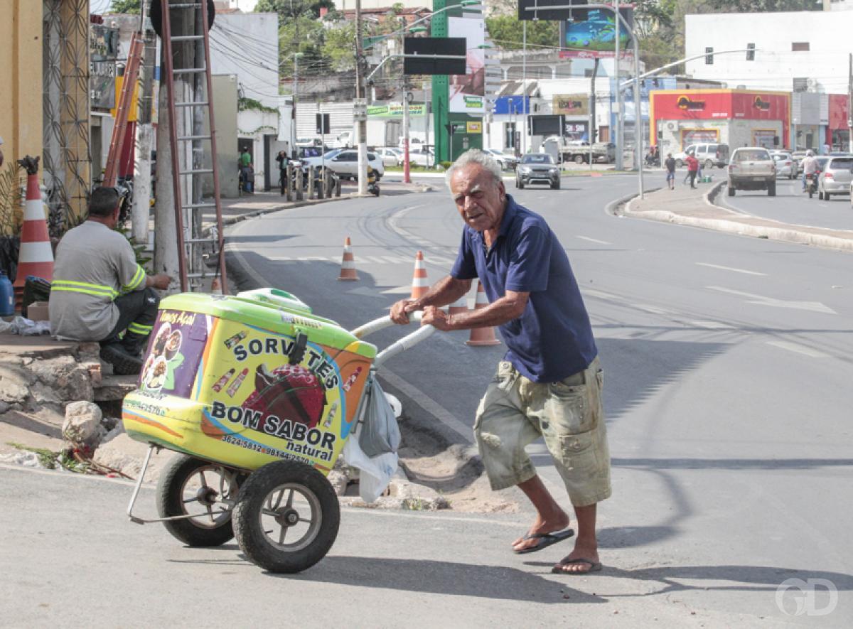 O relógio da avenida Mato Grosso apontava 34°C quando o aposentado Ademar Dourado Alcântara, de 74 anos, passava por ele, prestes a entrar na avenida Tenente Coronel Duarte, conhecida como Prainha, carregando em suas mãos um carrinho de picolé. Com o corpo banhado em suor e uma tosse incessante que o acompanha ao final de cada frase, ele vende picolés pelos bairros centrais das 9h às 17h há 12 anos.