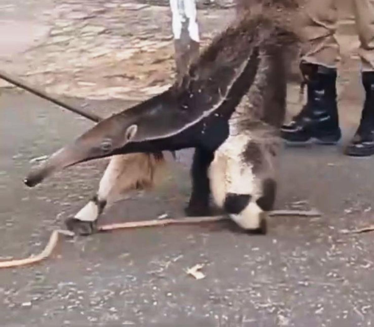 Imediatamente, uma viatura foi deslocada para realizar o resgate do animal, que era de grande porte e não apresentava ferimentos. Foram necessários dois militares para fazer a captura do tamanduá-bandeira em segurança. Após o resgate, o animal foi devolvido ao seu habitat natural.