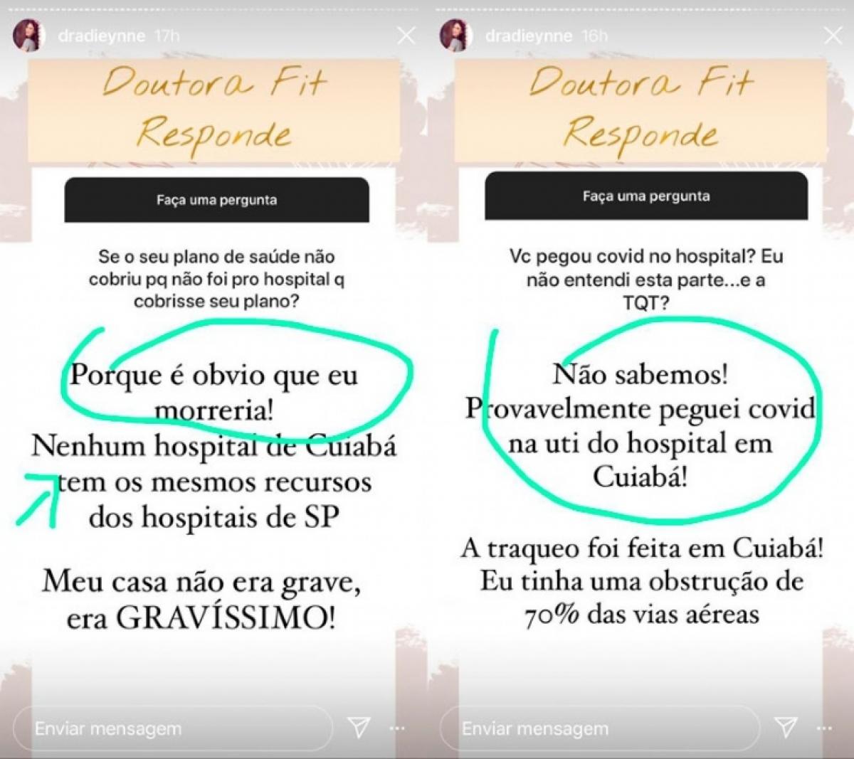 A “Doutora Fit”, como é conhecida, respondeu: “porque é óbvio que eu morreria! Nenhum hospital de Cuiabá tem os mesmos recursos dos hospitais de São Paulo. Meu caso não era grave, era gravíssimo!”, explicou.